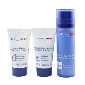 Clarins Men Hydration Essentials Set: Super Moisture Balm 50ml + Active Face Wash 30ml + Shampoo & Shower 30ml 3pcs