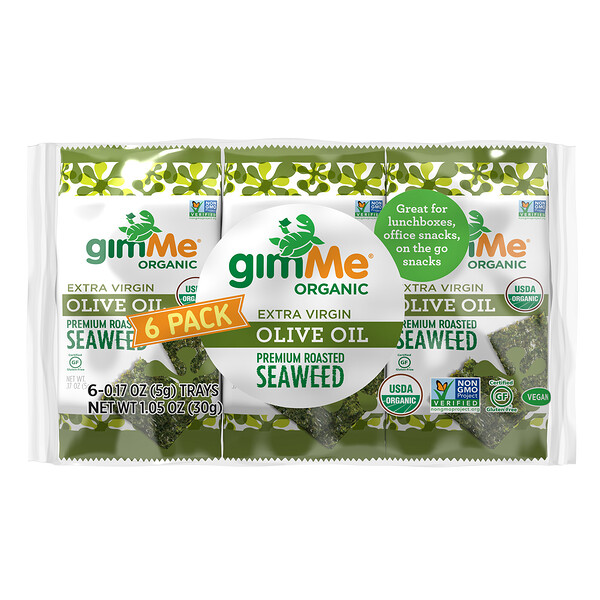 gimMe, Premium Roasted Seaweed, Extra Virgin Olive Oil, 6 Pack. 0.17 oz (5 g) Each